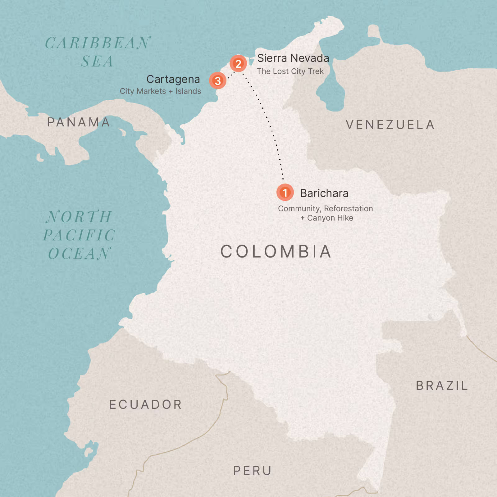 It’s also home to the ancestral territories of the Kankuamo, Kogui, Wiwa, and Arhuaco indigenous communities, and the Lost City, an ancient settlement built in 800 CE and rediscovered in 1975.